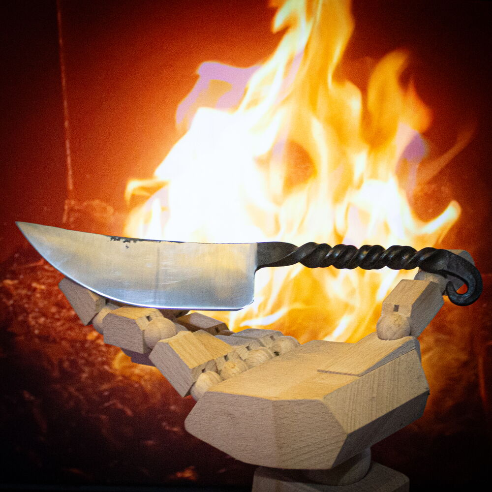 • Vanessa Forch haut mit einem Schmiedehammer auf ein glühendes Stück Stahl um es zu schmieden. Dabei sprühen Funken.